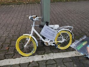 Ghostbike in Frankfurt-Nied (Foto: Wikitarisch, CC BY-SA 4.0 <https://creativecommons.org/licenses/by-sa/4.0>, via Wikimedia Commons)
